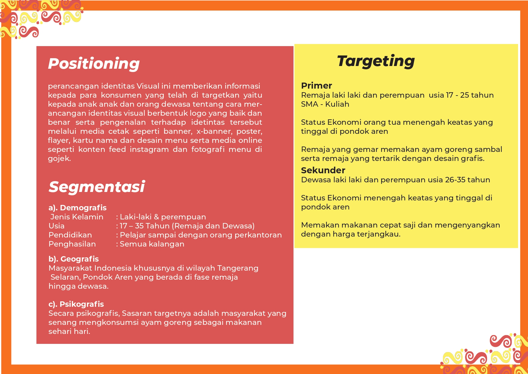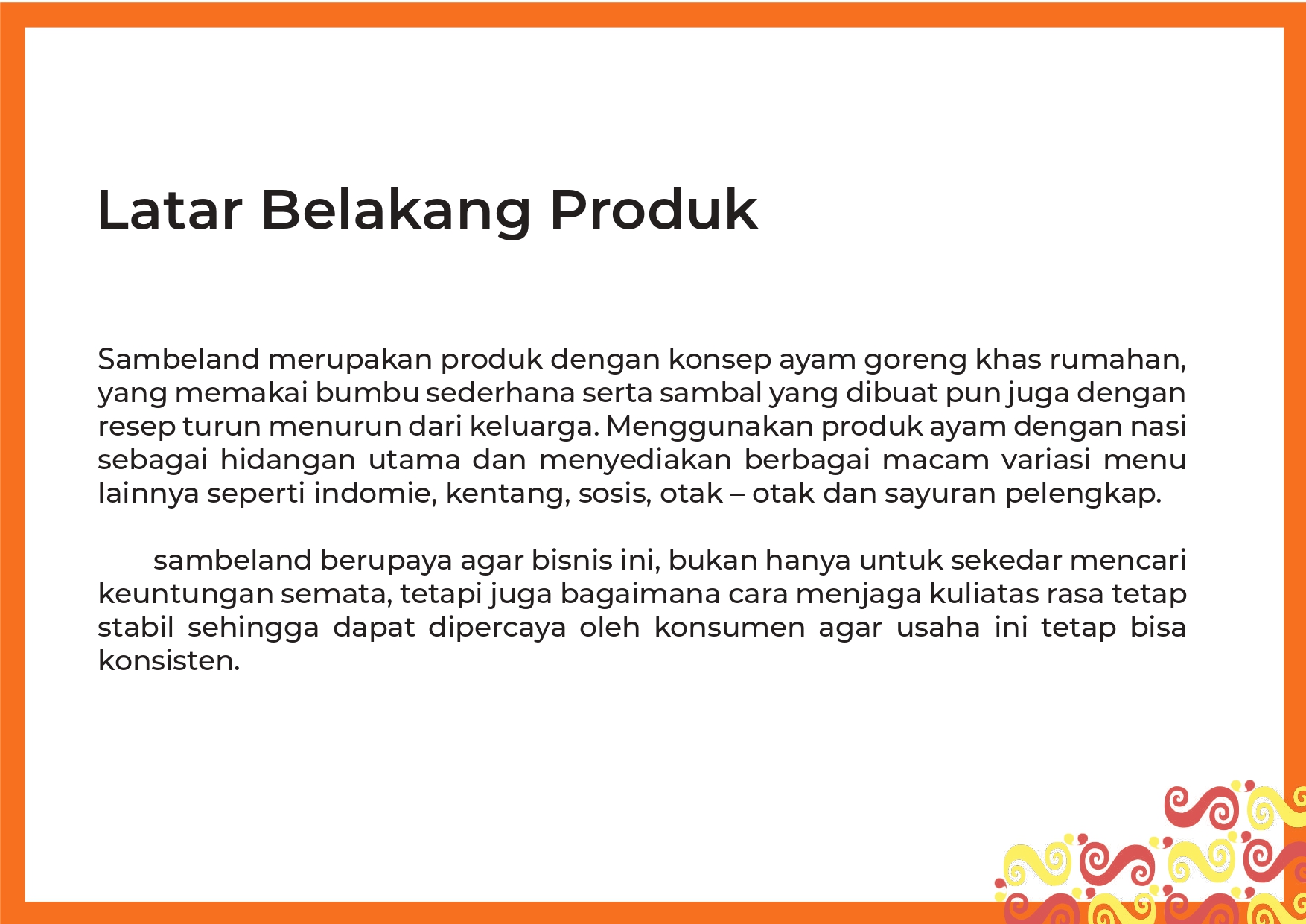 "Brand Kuliner Ayam Sambeland": Merujuk pada merek yang berfokus pada kuliner Ayam Sambeland. Ini menunjukkan bahwa perancangan visual identity difokuskan pada merek yang berhubungan dengan hidangan Ayam Sambeland, dengan tujuan mempresentasikan merek tersebut secara visual dengan cara yang efektif dan menggambarkan karakteristik unik dari hidangan tersebut.