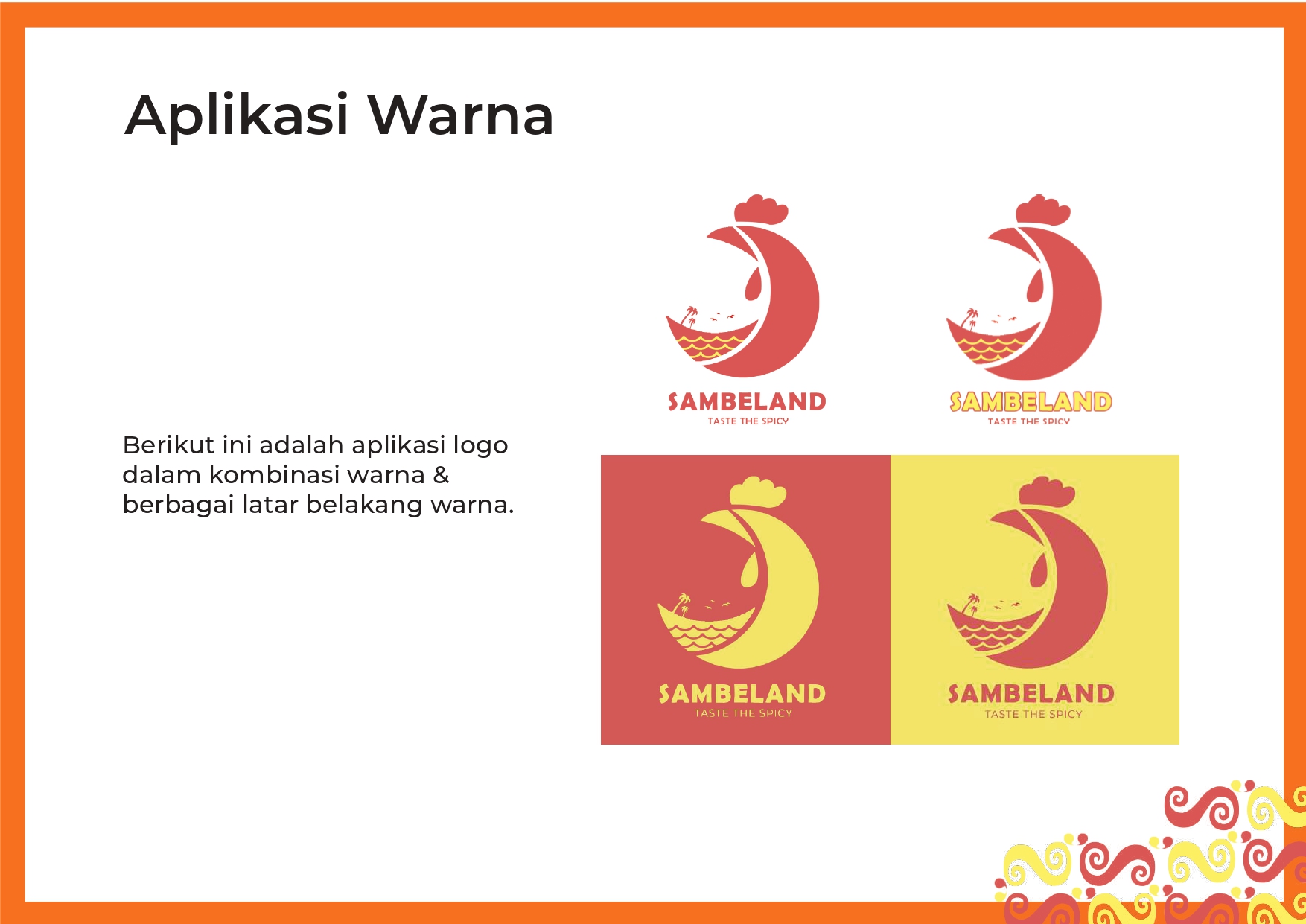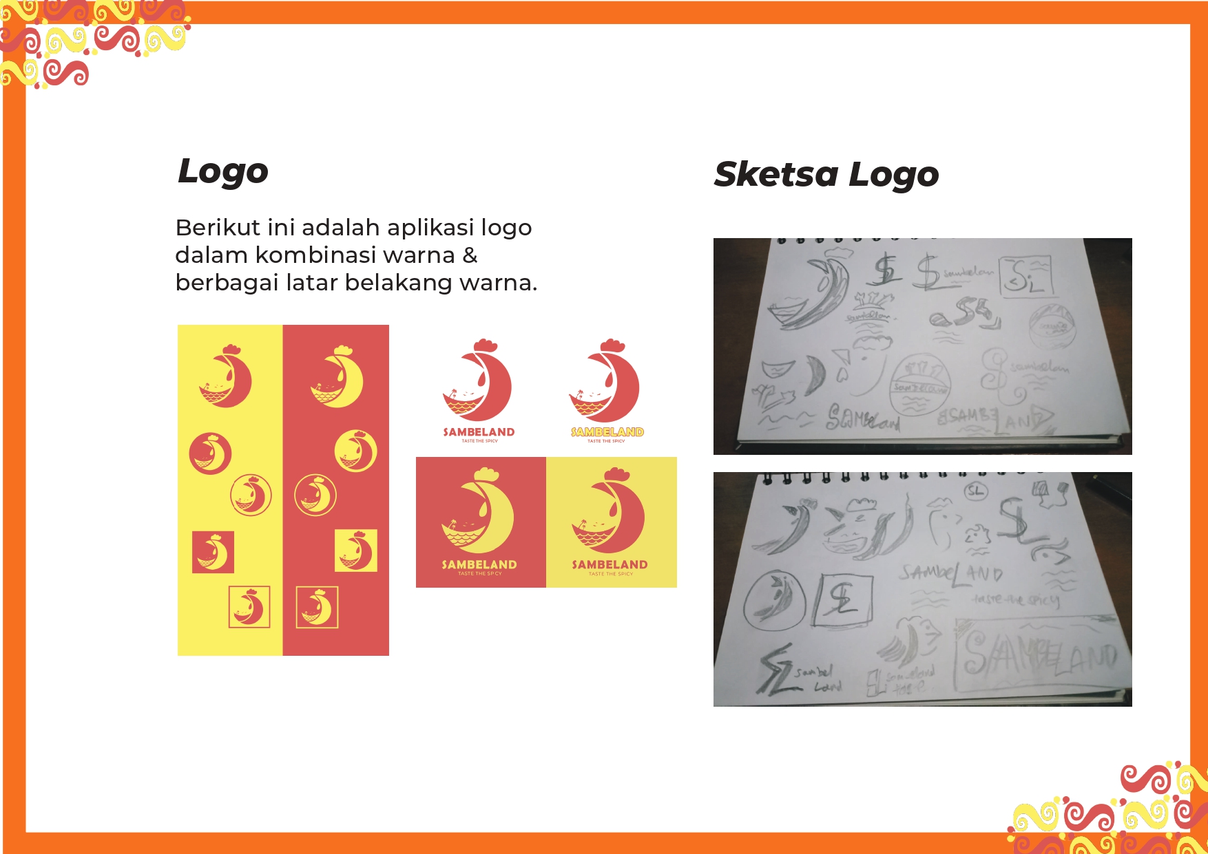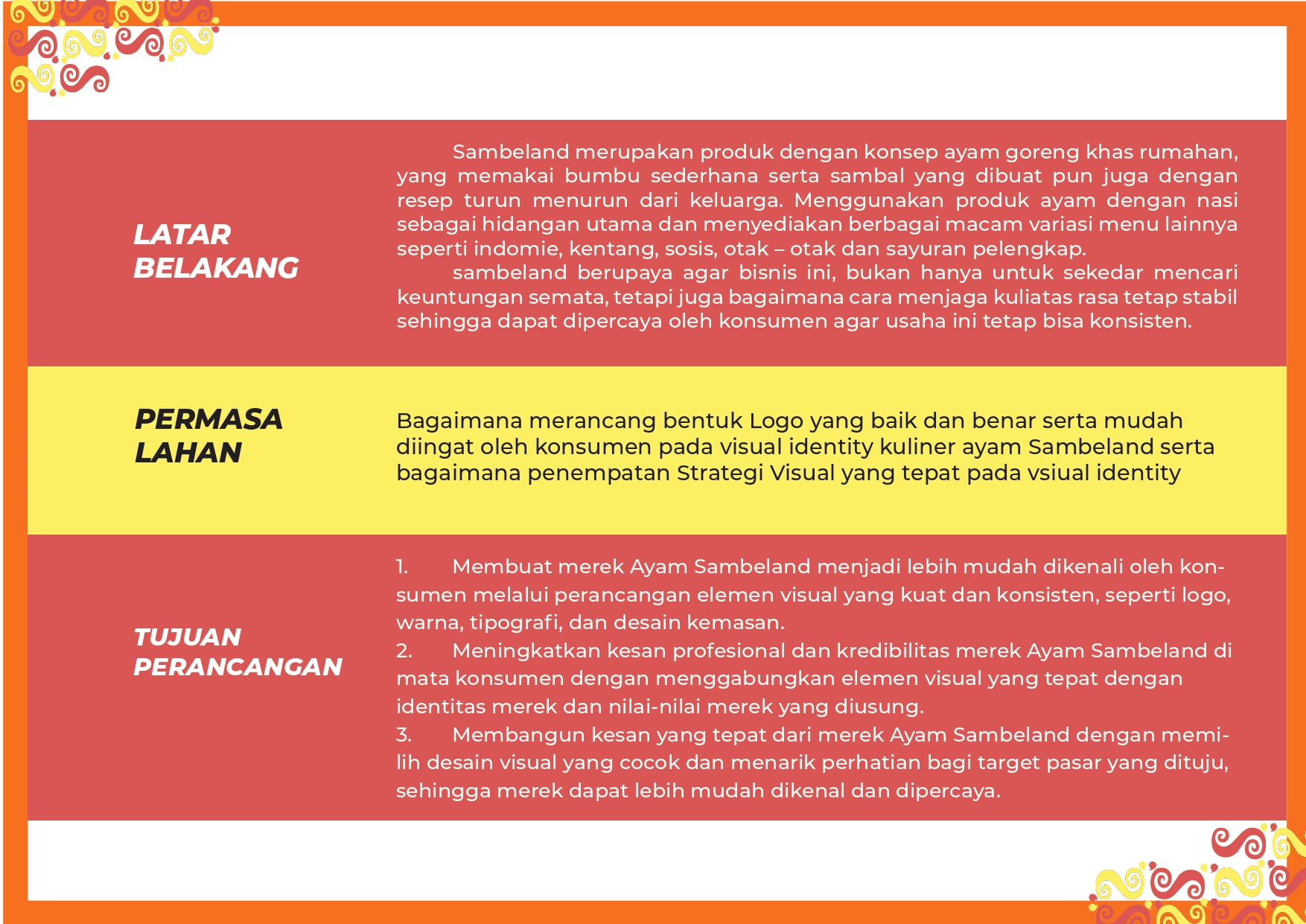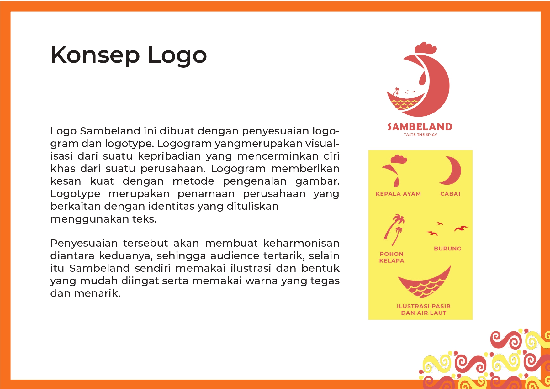 "Visual Identity": Mengacu pada elemen-elemen visual yang mewakili dan membedakan merek kuliner Ayam Sambeland. Ini termasuk logo, warna, tipografi, ilustrasi, dan elemen visual lainnya yang membentuk tampilan merek secara keseluruhan.