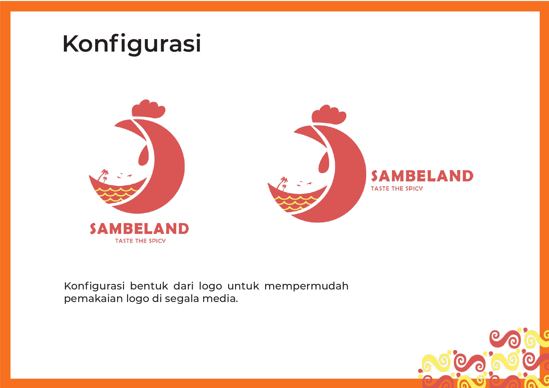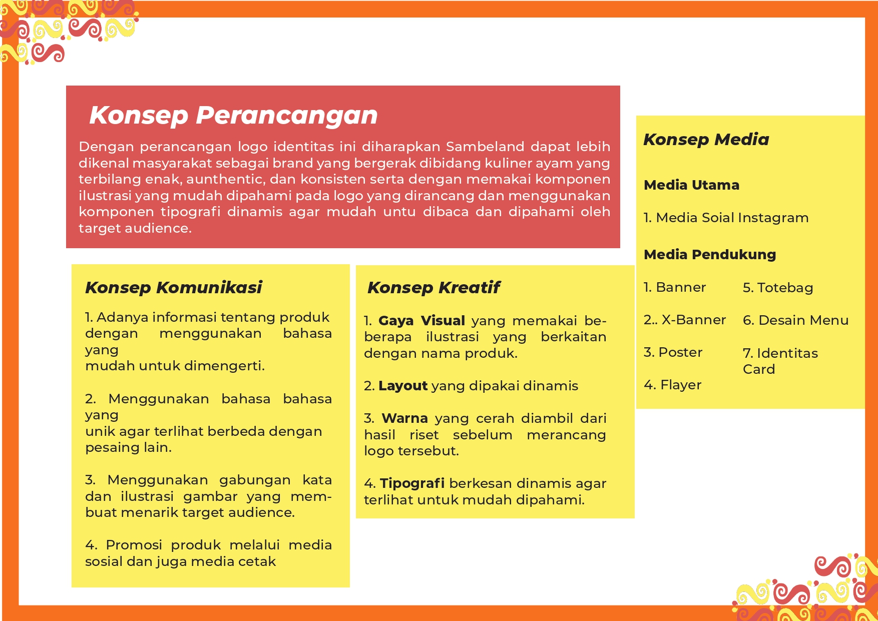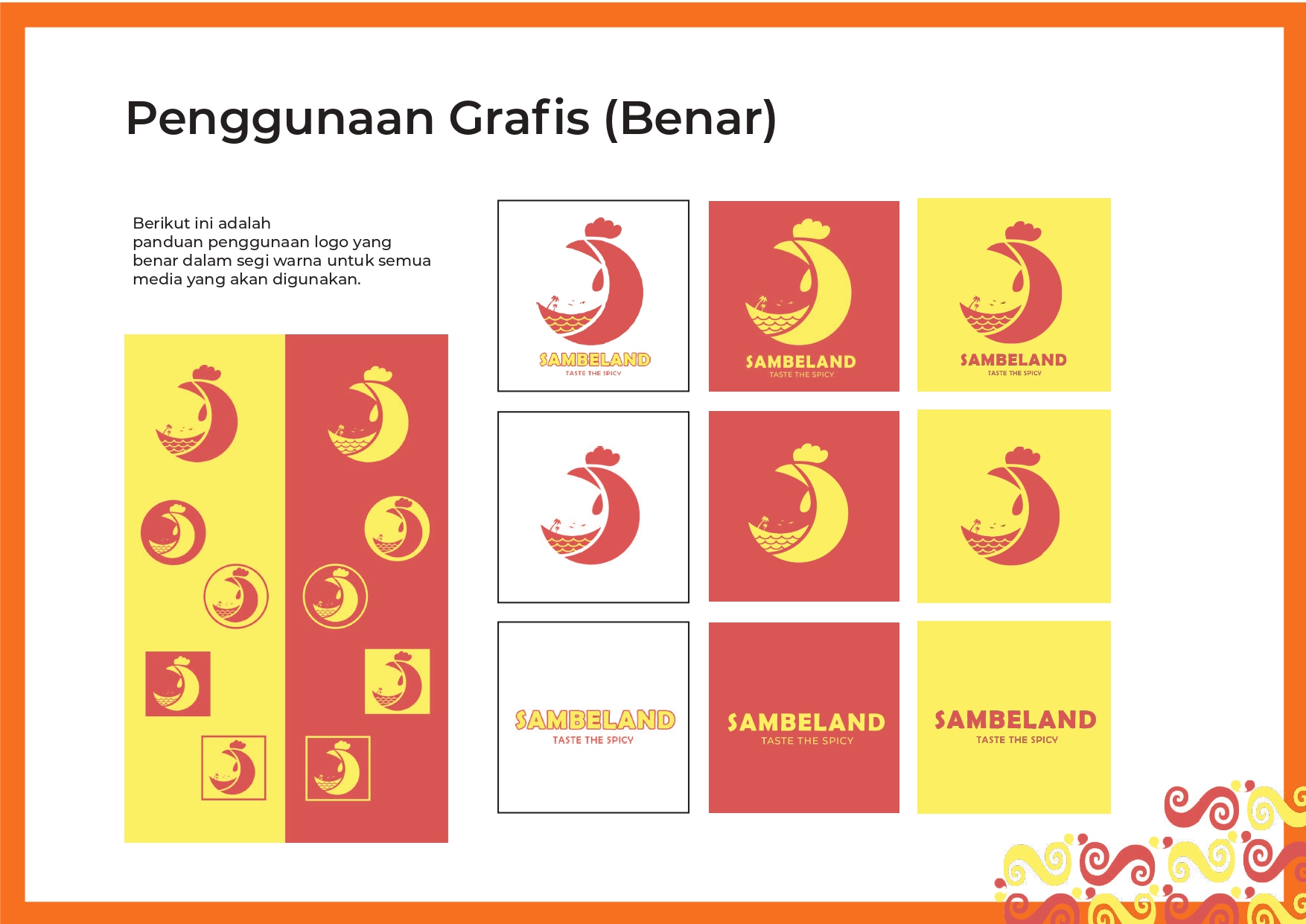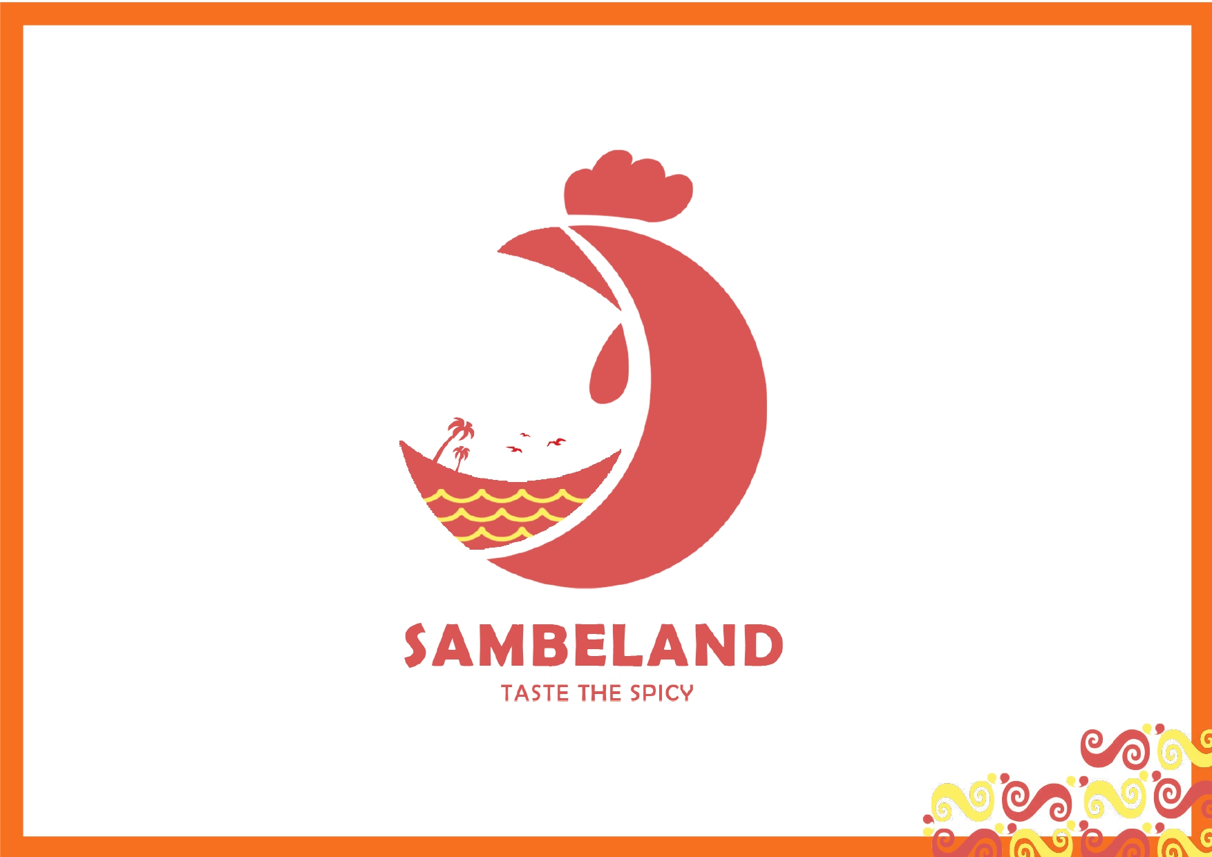 "Visual Identity": Mengacu pada elemen-elemen visual yang mewakili dan membedakan merek kuliner Ayam Sambeland. Ini termasuk logo, warna, tipografi, ilustrasi, dan elemen visual lainnya yang membentuk tampilan merek secara keseluruhan.
