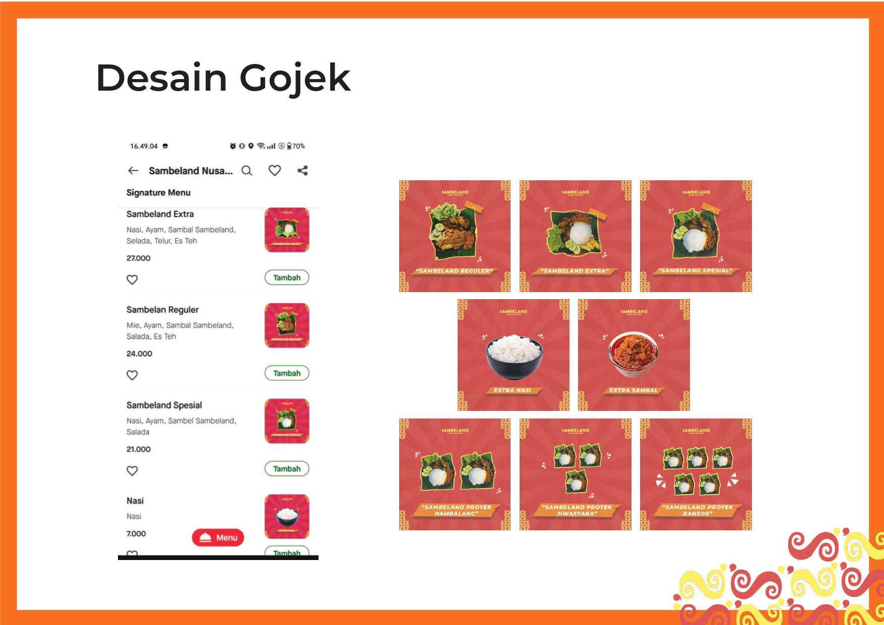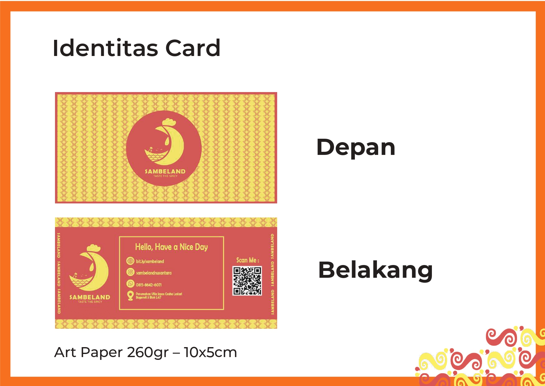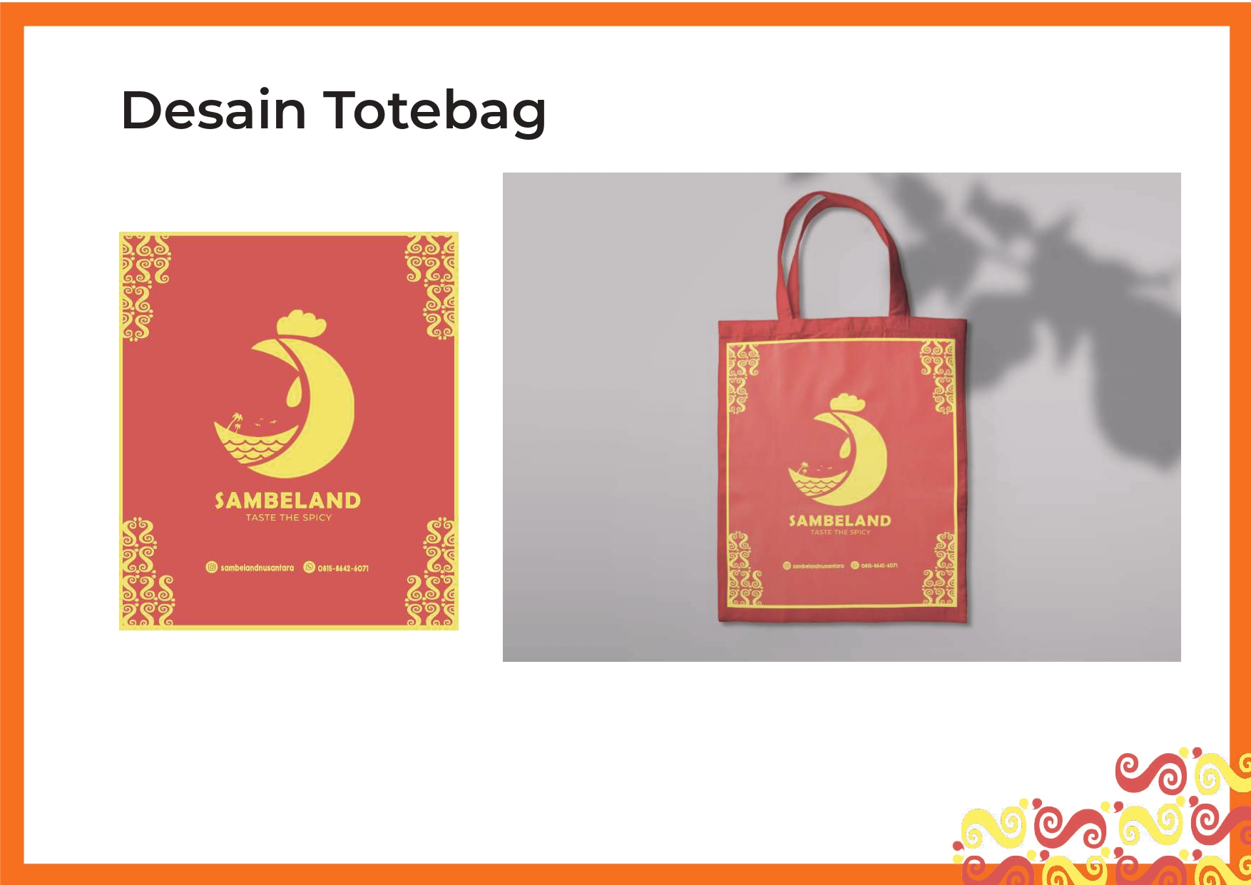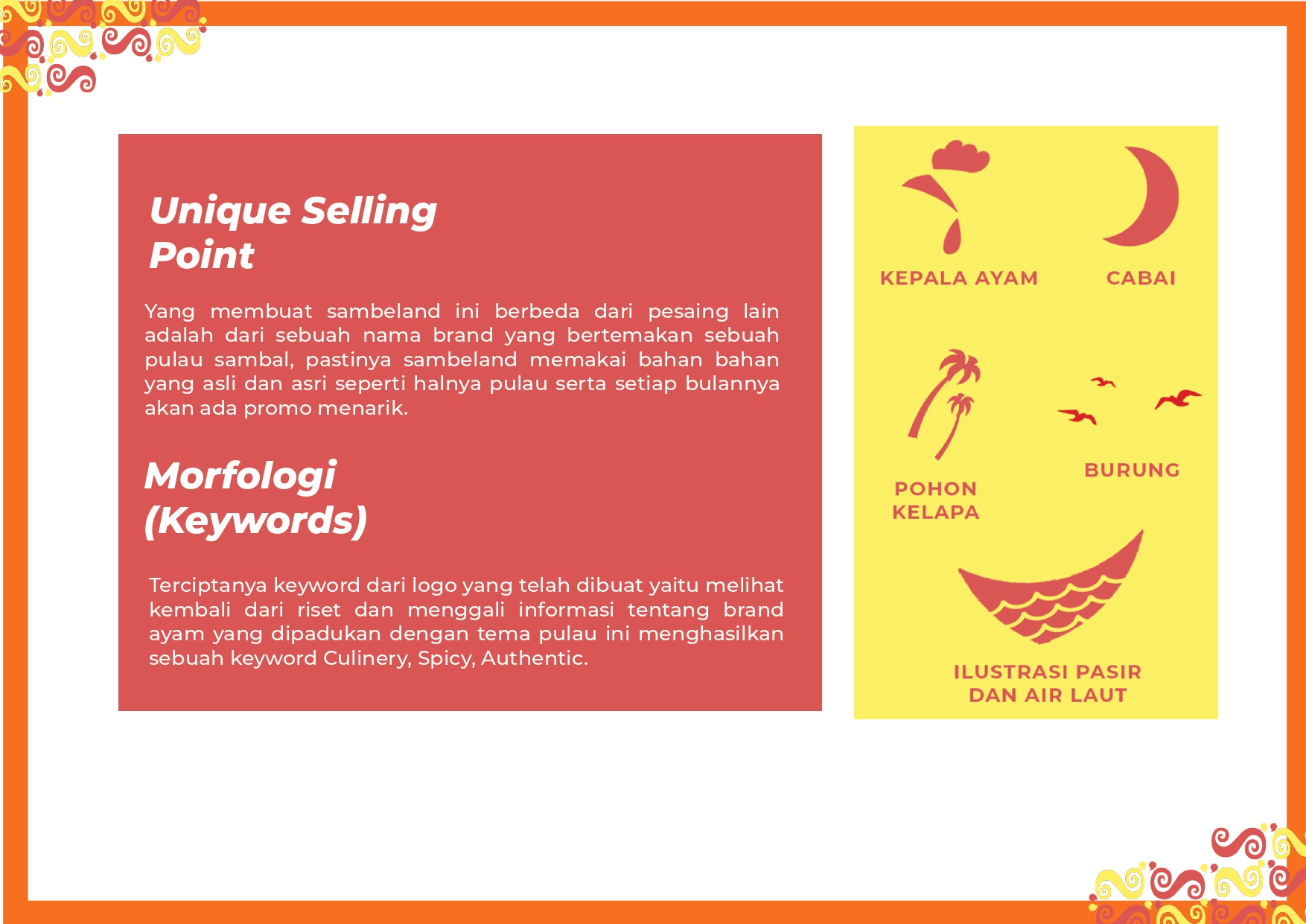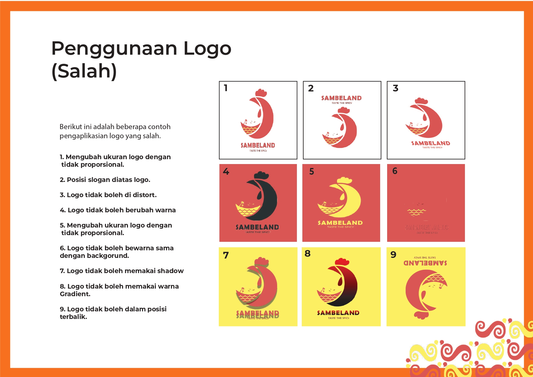 "Visual Identity": Mengacu pada elemen-elemen visual yang mewakili dan membedakan merek kuliner Ayam Sambeland. Ini termasuk logo, warna, tipografi, ilustrasi, dan elemen visual lainnya yang membentuk tampilan merek secara keseluruhan.