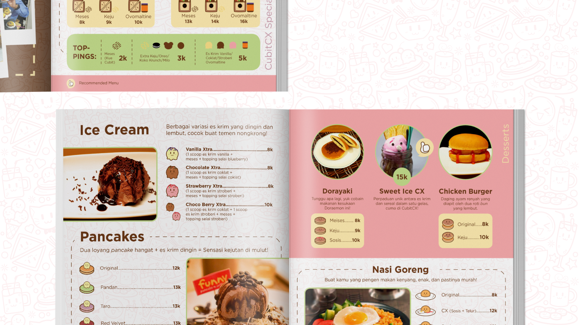 Karya berikut ini merupakan hasil redesign dari buku menu kafe CubitCX, sebuah kafe yang terletak di Bekasi, Jawa Barat yang menyediakan kue cubit sebagai hidangan utamanya (signature dish).
